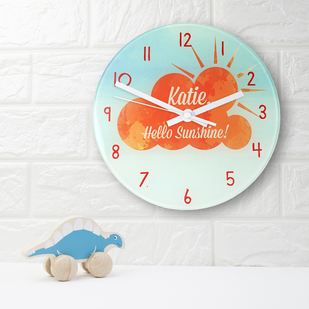 For your little ray of sunshine! This adorable clock will fit in any little one’s room or nursery. This 20cm glass wall clock is great to hang in their bedrooms. Personalise with a name up to 15 characters. The words ‘Hello sunshine!’ come as standard. Please note that the small clocks come with white hands and the large clocks come with black hands on the clock.