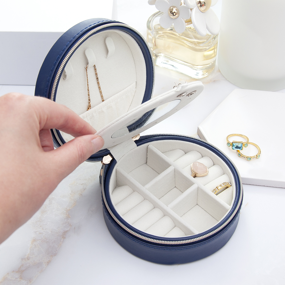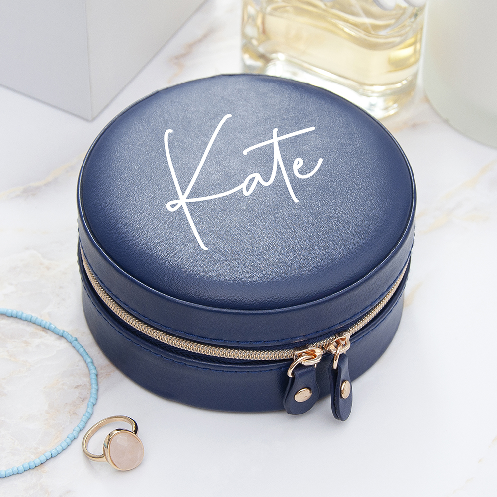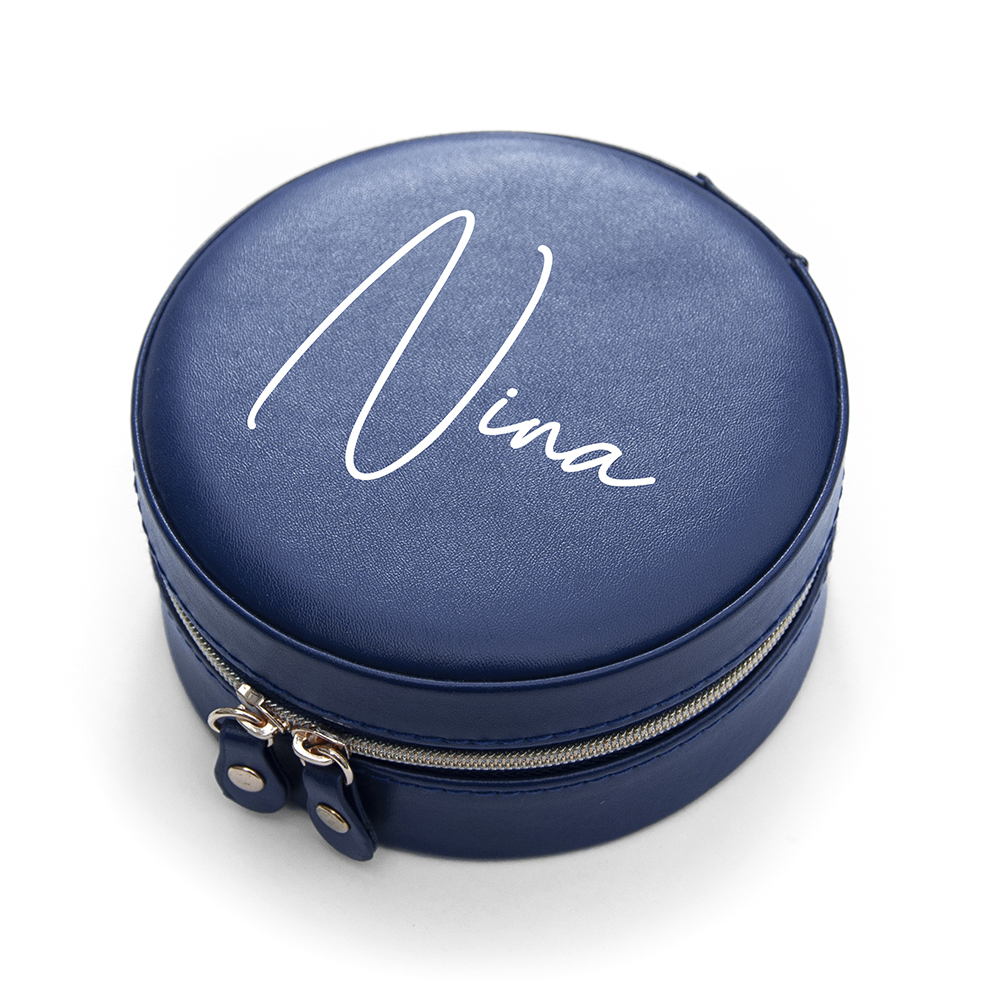 For a stylish way to keep a loved one’s jewellery safe when out and about, look no further than our beautiful personalised blue round jewellery case. The ultimate birthday gift for her, she deserves it! The eye catching combination of divine beauty and useful practicality come together to form a head turning jewellery case, that special person in your life is sure to love and use on nights out with friends.