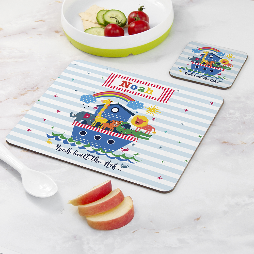Containing a placemat and a coaster, this placemat set features a bold and colourful image of Noah’s Ark filled with animals floating safely on the water underneath a magical rainbow. ‘Noah built the Ark’ comes as standard text with this design.
