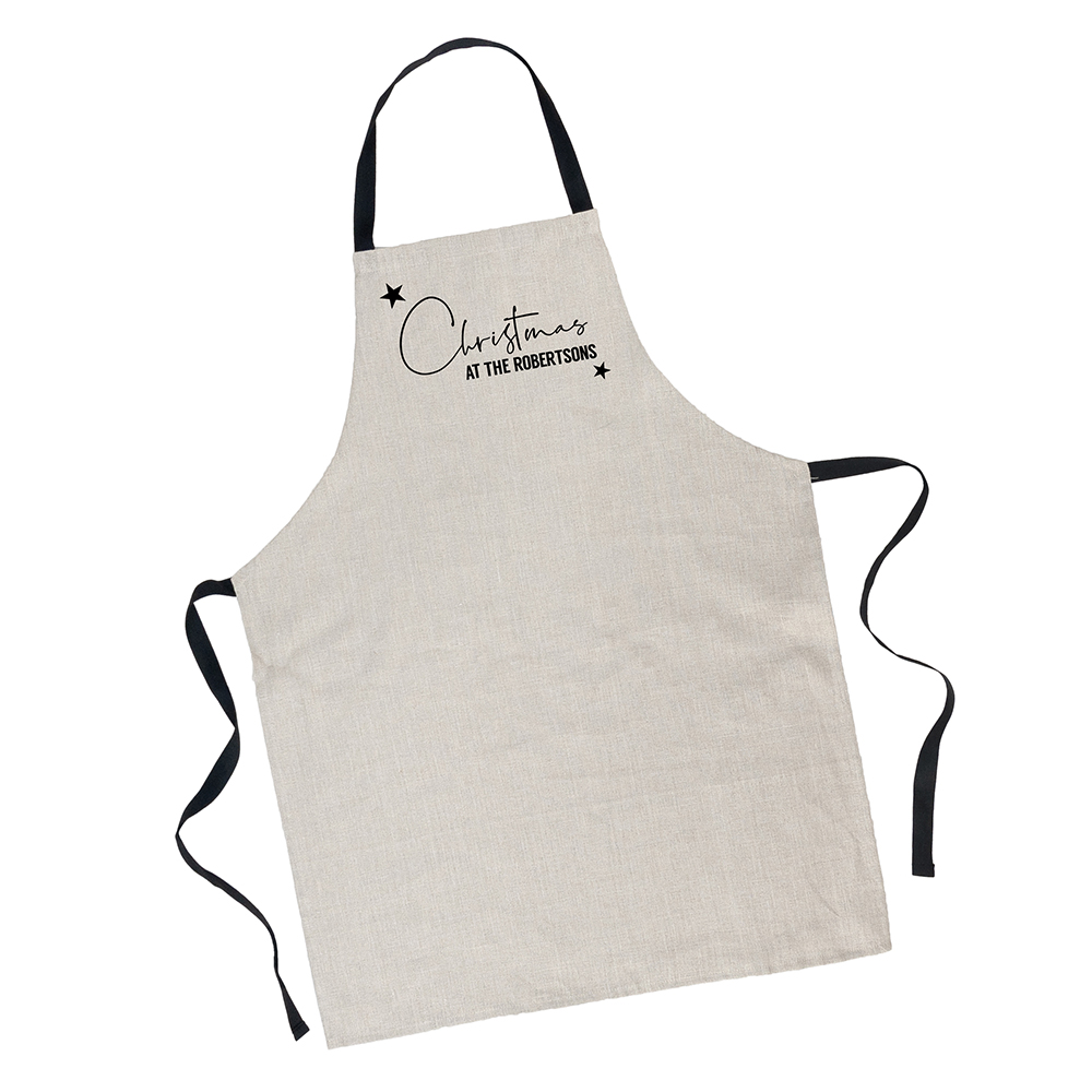 ‘Christmas at the [Surname]s’ comes as standard text in black.’Christmas’ will be written in a Christmassy black script font as standard with rest written in block black capital letters. The design is topped by two gorgeous stars. The neck strap and waist tie are black, while the main body of the apron is a natural beige.