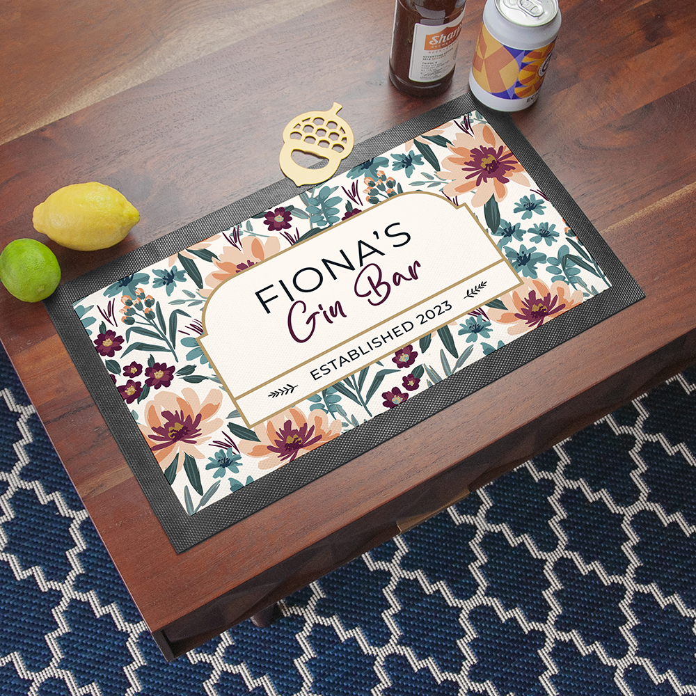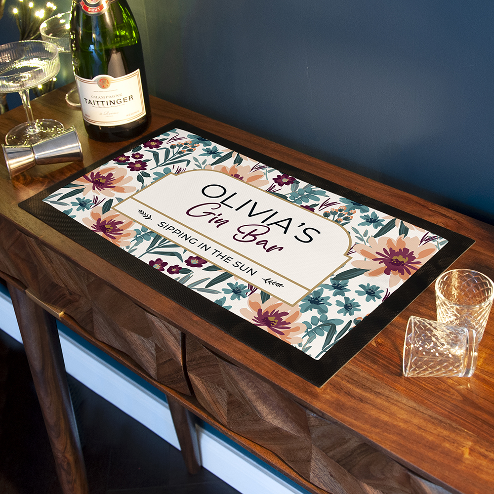 Make her day with this super stylish personalised floral gin bar mat! This stunning rubber bar mat will make the perfect addition to any home bar setup or kitchen. Whether you buy it as a birthday present or a romantic gesture, this is sure to wow your special someone (as well as everyone else who uses it)! What’s more, it’ll also help keep your table free from spills – after all, gin nights are rarely ever straight forward!