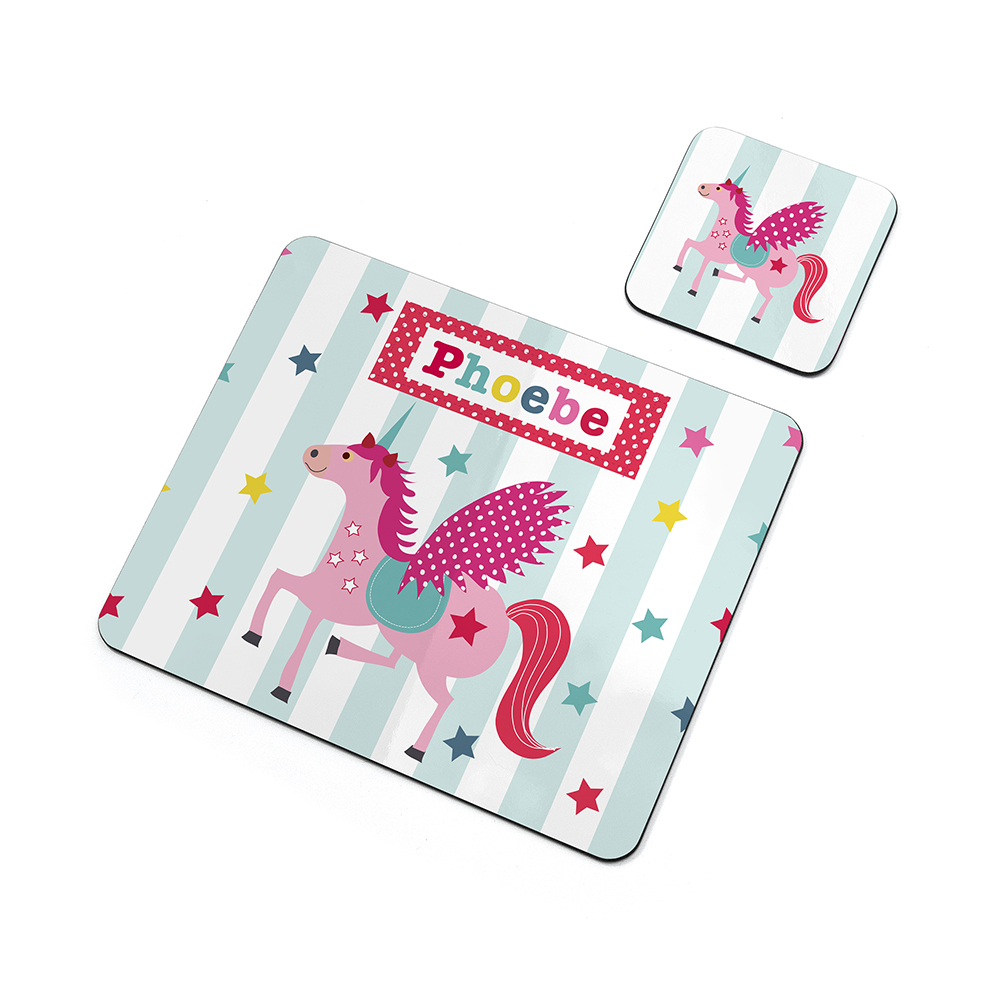For a child’s birthday or Christmas gift that’s guaranteed to make dinner time a lot more fun and enjoyable, look no further than our personalised girl’s unicorn placemat set. Perfect for messy eaters, this durable and easy to clean placemat set is great for protecting your dining table from dinner time spills and marks caused by plates, food or cups.