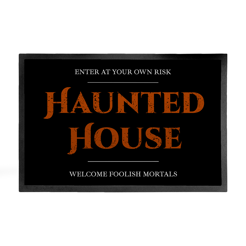 This black rubber doormat features the standard text’Enter at Your Own Risk’ in block white capitals at the top,’Haunted House’ in orange capitals as standard with your own message in white capitals on at the bottom of this treat of doormat.