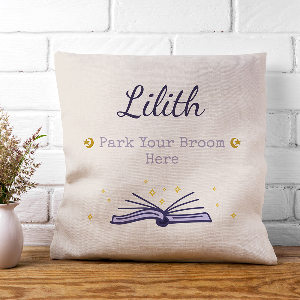 As part of this design,’Park your broom here’ comes as standard text with a magical book of spells providing the focal point for this piece just underneath. At the top of your cushion cover, your loved one’s name will be placed in a bold script font.