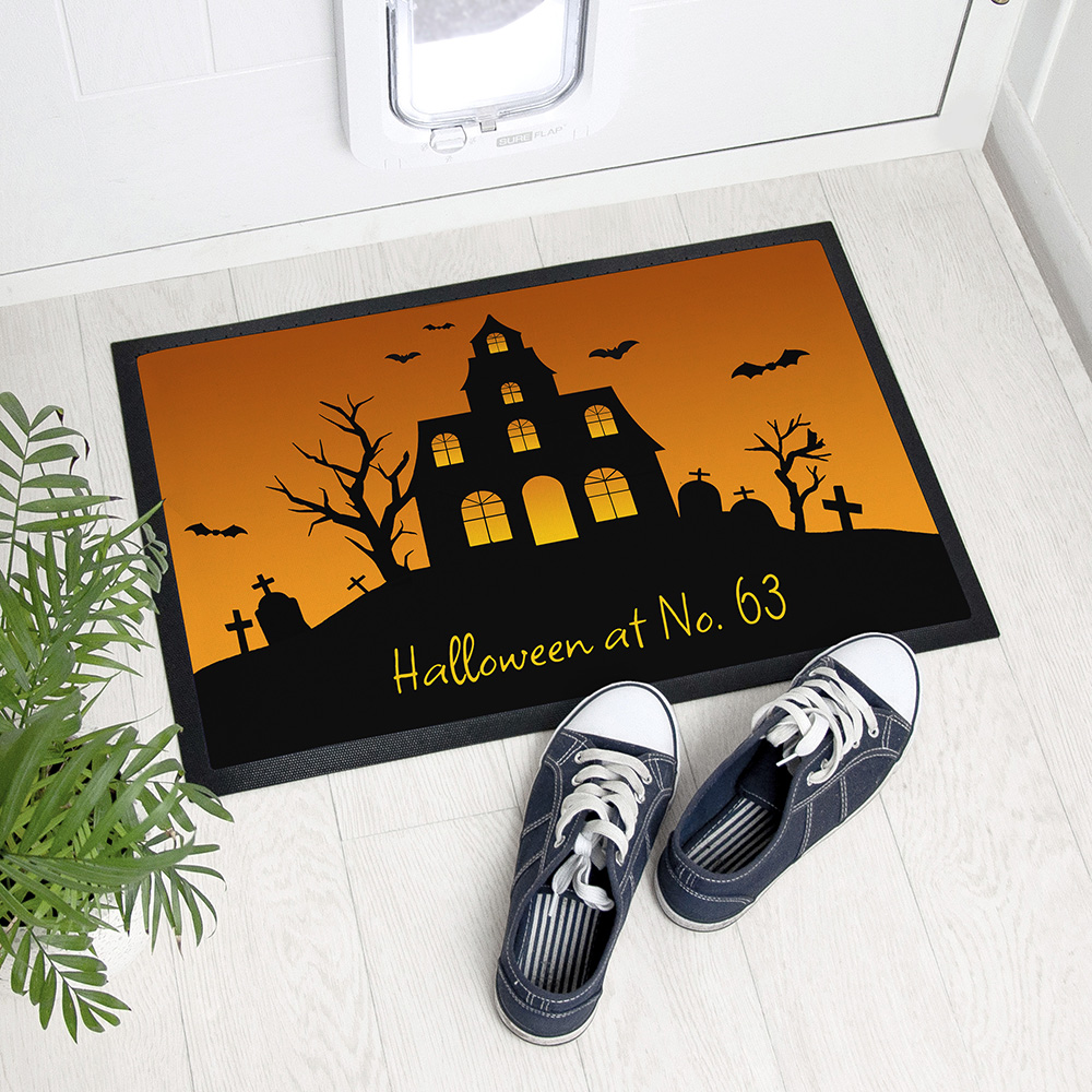 Our spook-tacular personalised Halloween spooky house indoor doormat is the perfect way to welcome trick-or-treaters to your spooky house this Halloween! Made from durable rubber, this doormat is designed to withstand heavy foot traffic, making it ideal for busy households. The Halloween-themed design features a spooky house surrounded by eerie graves, trees and bats, and is sure to give everyone who sees it the fright of their life.