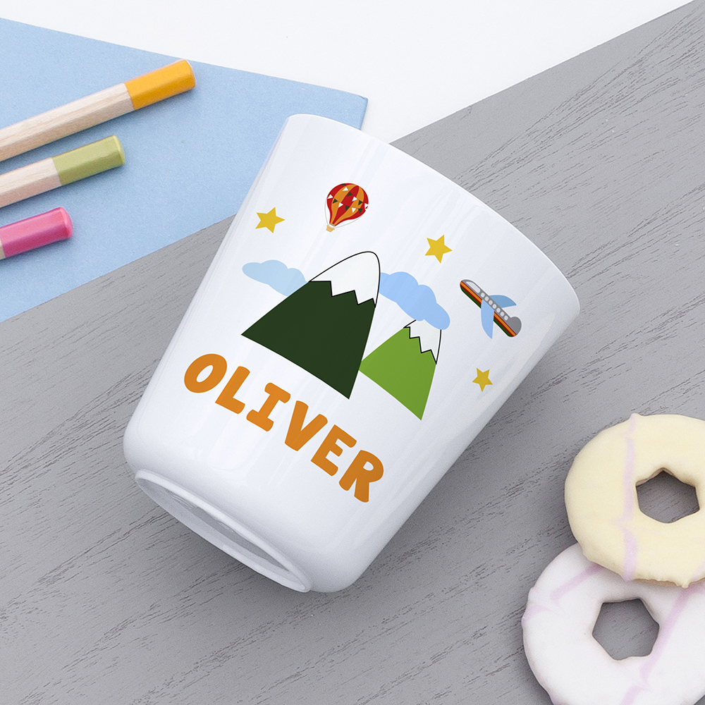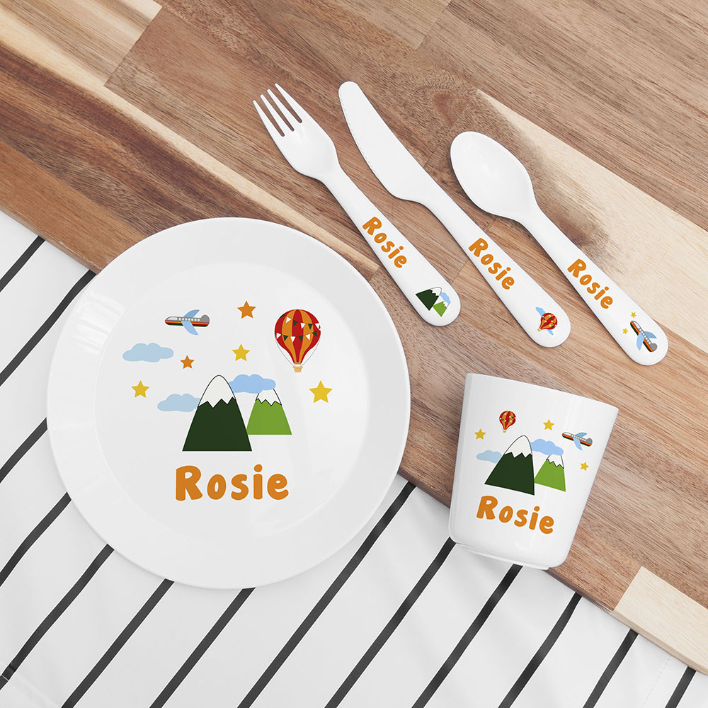 Get your little ones excited for mealtimes with our Personalised Children’s Adventure Dinner Set. Containing a plate, knife, fork, spoon, and cup, with this set you’ll have everything you could possibly need for everyday meals. Each piece is printed with colourful matching illustrations of mountains, planes, and hot air balloons that are sure to inspire and delight!