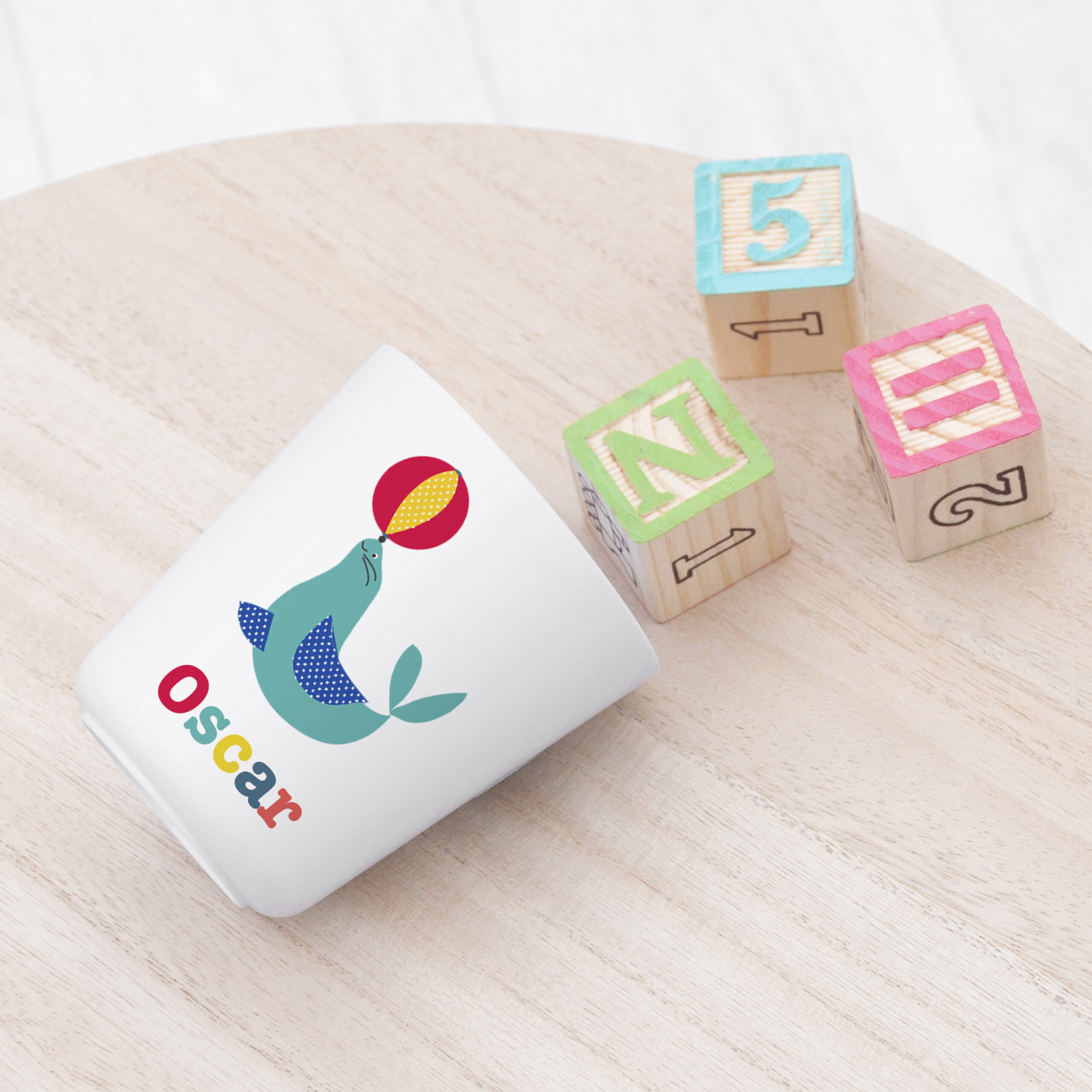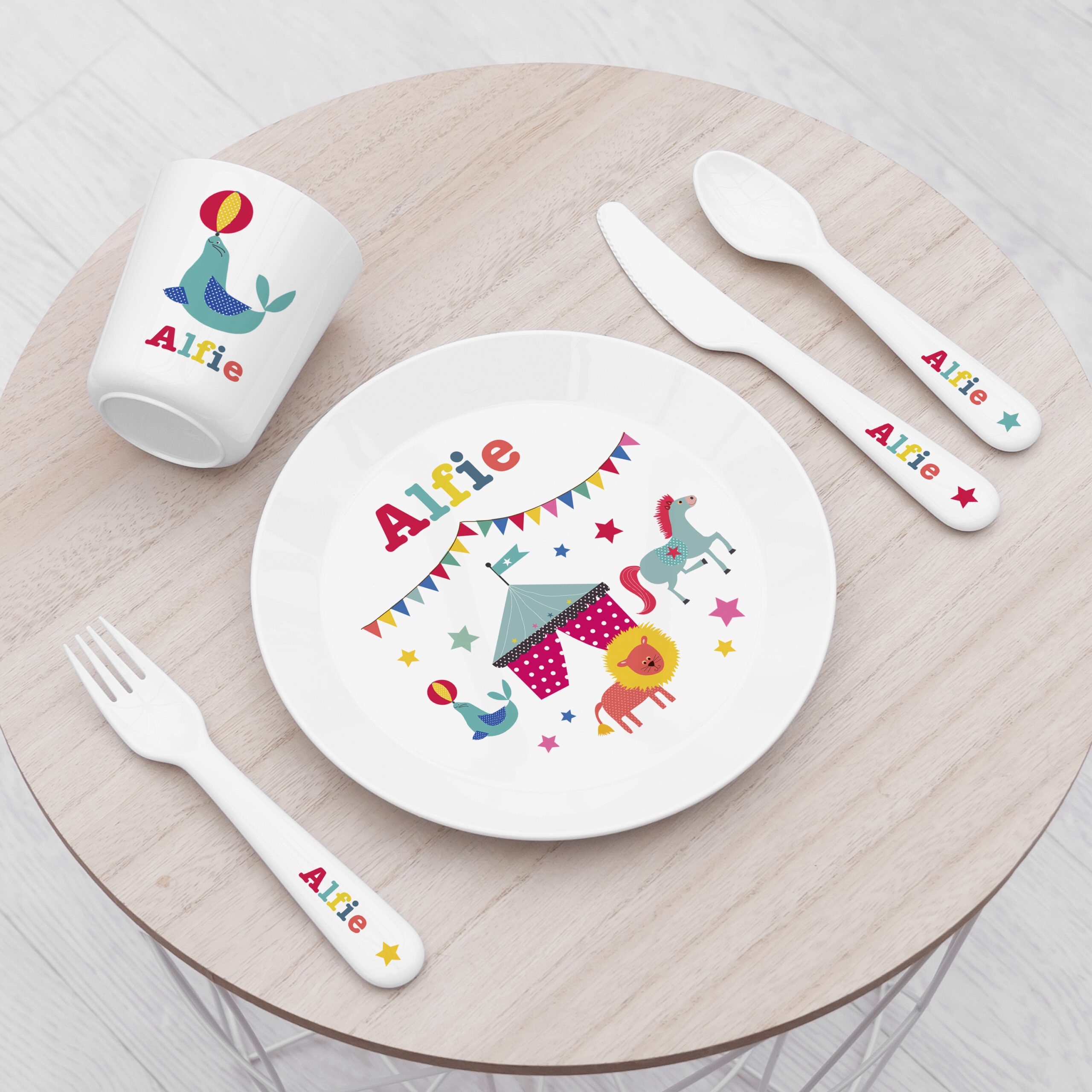 The plate features a fantastical circus scene complete with a seal balancing a beach ball on its nose, galloping horse, lion, tent and bunting on a starry background. The utensils feature a star and the cup has a giant image of the talented seal.