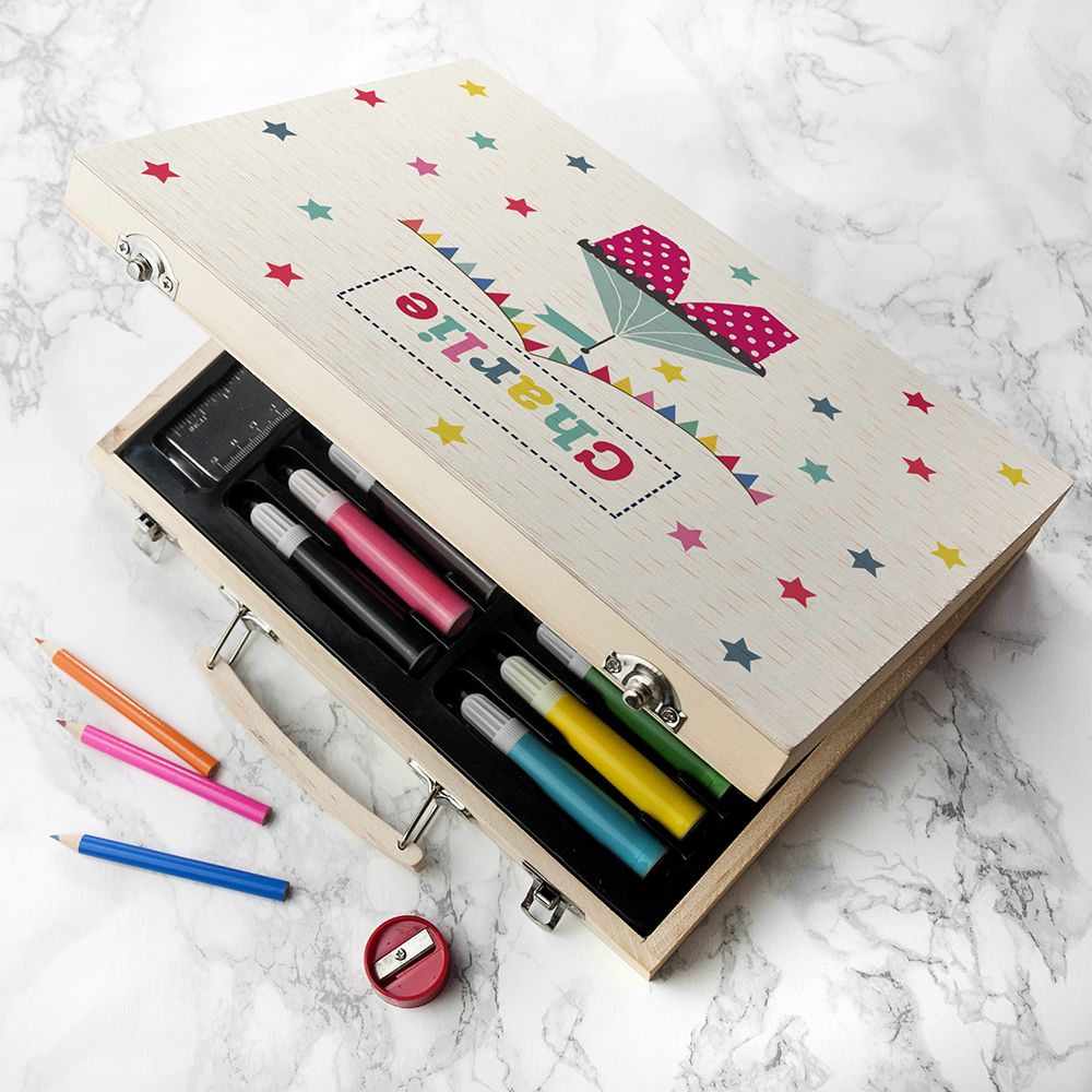Watch as they explore the wonderful world of colours and shapes while developing essential skills like concentration, fine motor skills, and creativity. The lid of your wooden colouring set box will feature a fun and stylish circus tent design with an array of colour stars and bunting. Your loved one’s name will be printed in colourful letters above the image of the tent by our specialist creative team.