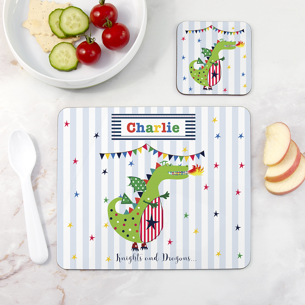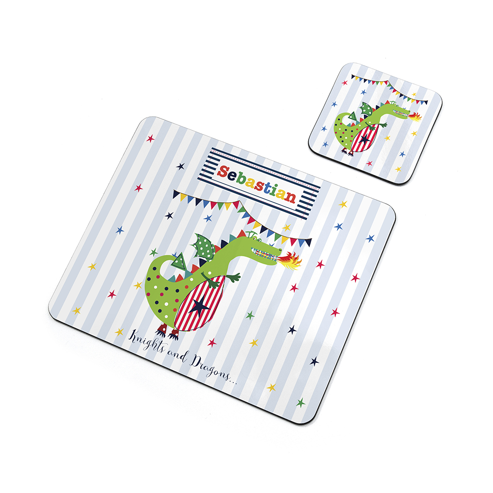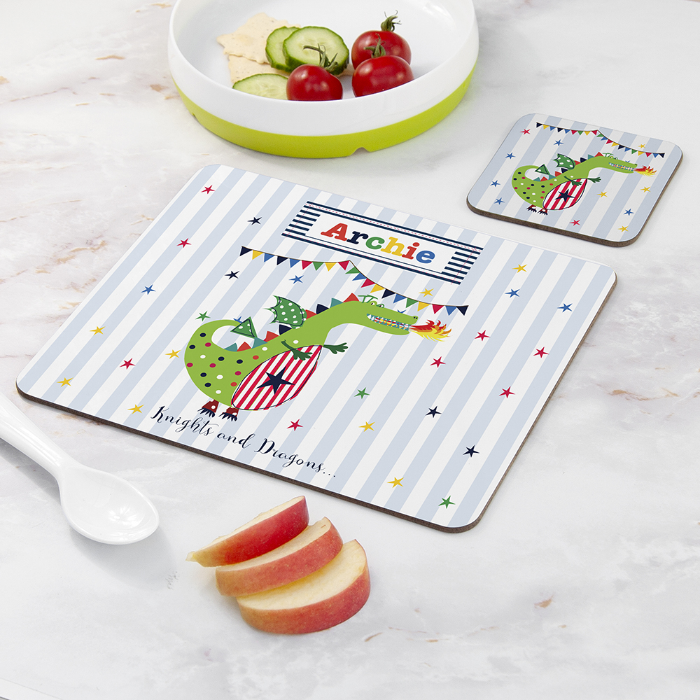 This fantastic placemat set contains a fun coaster and placemat. Both will feature a super cute happy looking fire breathing dragon under some bunting. This will be placed on a light blue striped background with colourful stars, which add to the mystical magic of the design.