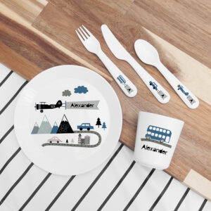 Each utensil will feature an animal from Noah’s Ark: the fork has a crocodile, the knife has a lion and the spoon has an elephant. Every piece of cutlery comes with your little one’s name boldly emblazoned on the side of your cutlery set in bright and colourful letters for all to see.