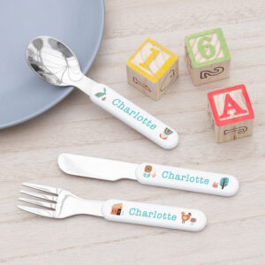 Your little ones will be eager for dinnertime with our standout Personalised Children’s Pastel Sky Cutlery set in metal, featuring fantastic illustrations which are sure to add a ray of sunshine to dinner. Your little one is growing up and beginning to eat like a big boy or girl, all by themselves, so why not treat them to their first cutlery gift set?