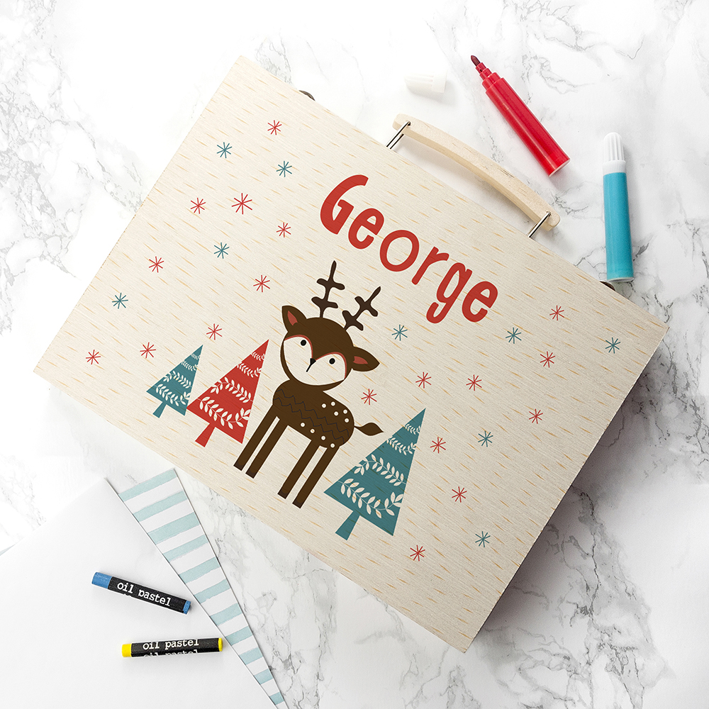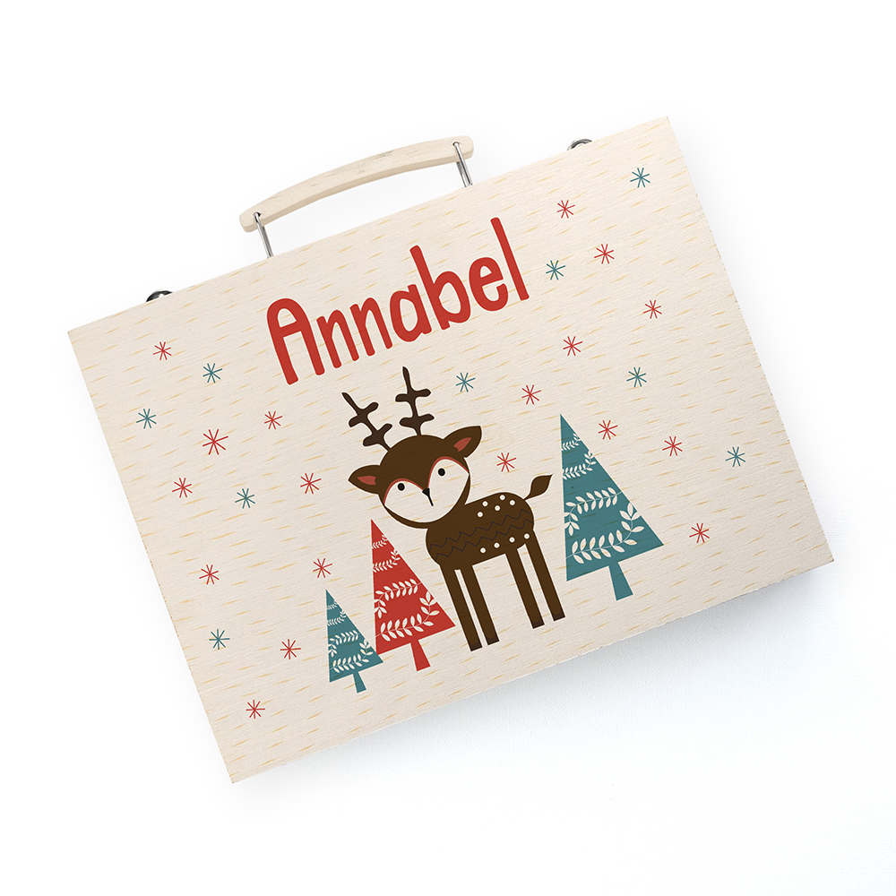 The lid of your wooden box features a colourful image of an adorable reindeer in a woodland area on a snowy day. Your child’s name will feature prominently above this image in red text as standard.