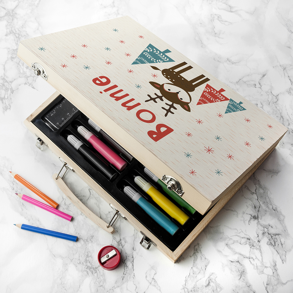 This stunning wooden box closes with two small brass clasps, so that their belongings don’t fall out and a handle which makes this a portable gift for your creative little one which they can play with at home, take on holiday, bring to school or a friend’s house.