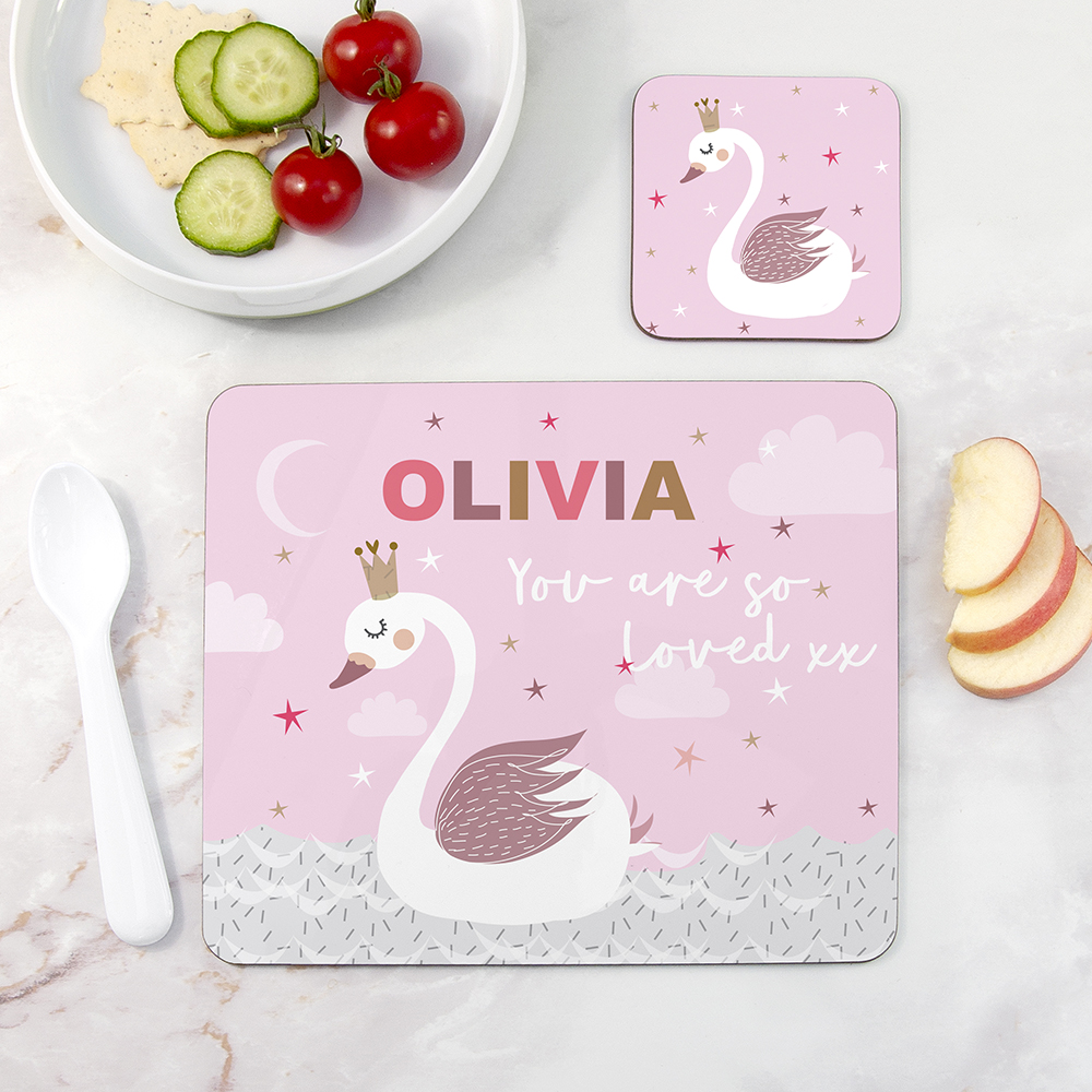 Your little one will love our sleek and elegant personalised girl’s swan placemat set. An amazing children’s birthday or Christmas gift that will transform dinnertime into a wonderful adventure. This stunning piece of tableware is strong and easy to wipe clean, making it ideal for even the messiest of eaters.