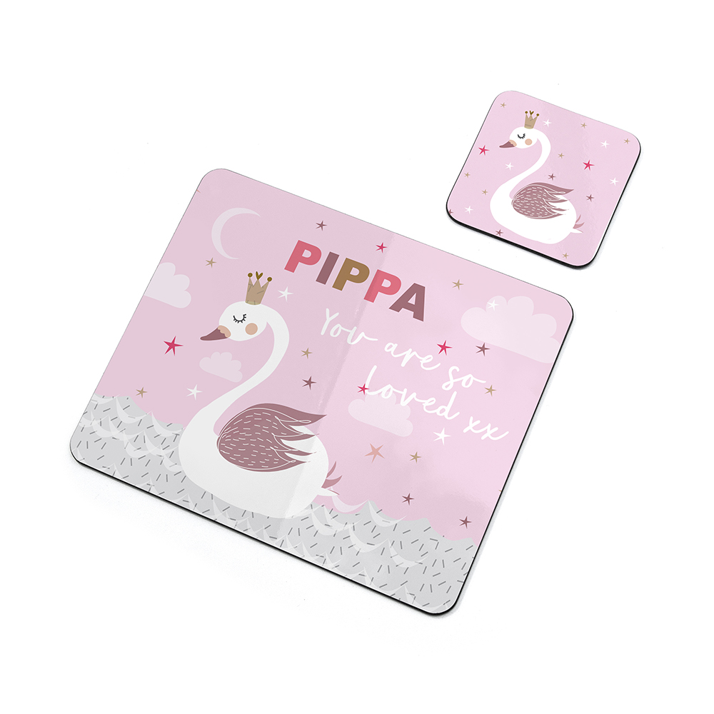 Our gorgeous placemat sets feature a beautiful and durable MDF coaster and placemat. Both feature a graceful and classy swan, elegantly gliding on the water – with a crown on because they’re river royalty. This image will be placed on a starry pink background and ‘you are so loved xx’ comes as standard text. On the placemat, above this image, comes your loved one’s name in pastel capital letters – so everyone knows whose placemat set it is. No more dinnertime mixups!