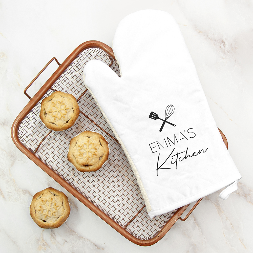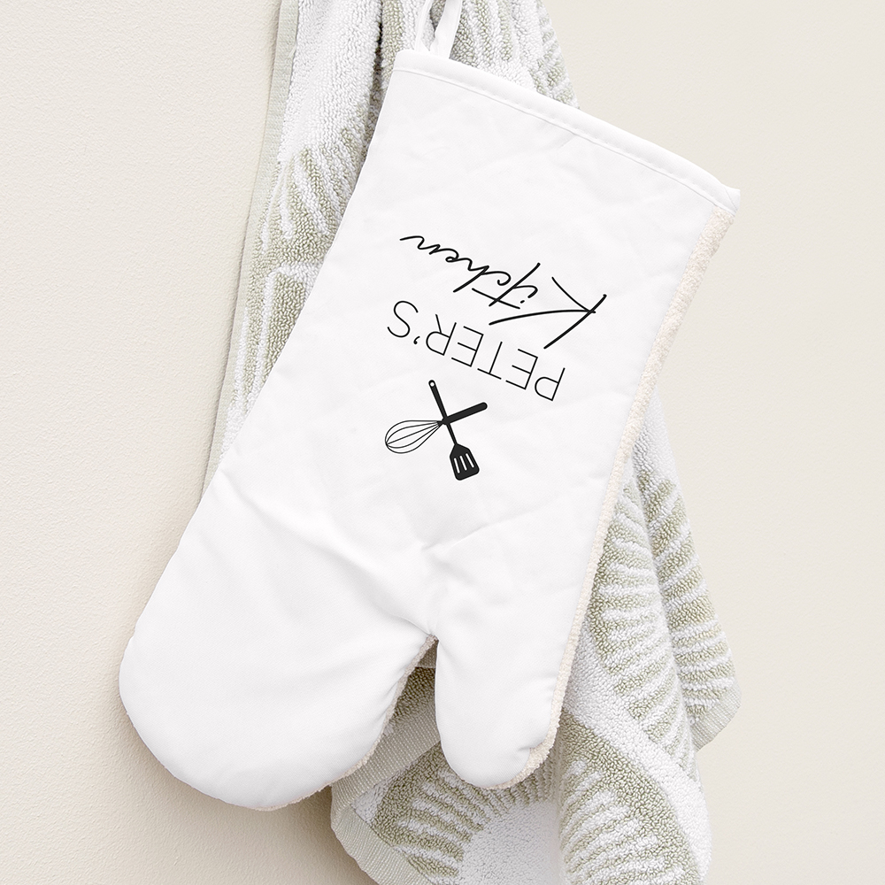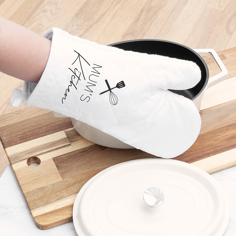Personalise with their name – to show everyone that they are the star baker of the house who owns the kitchen. Our amazing team of artisan creatives will then painstakingly print it onto their stylish oven mitt for them, for an extra special and deeply meaningful birthday gift or Christmas present they’re bound to love and whip out when hosting their dinner parties.
