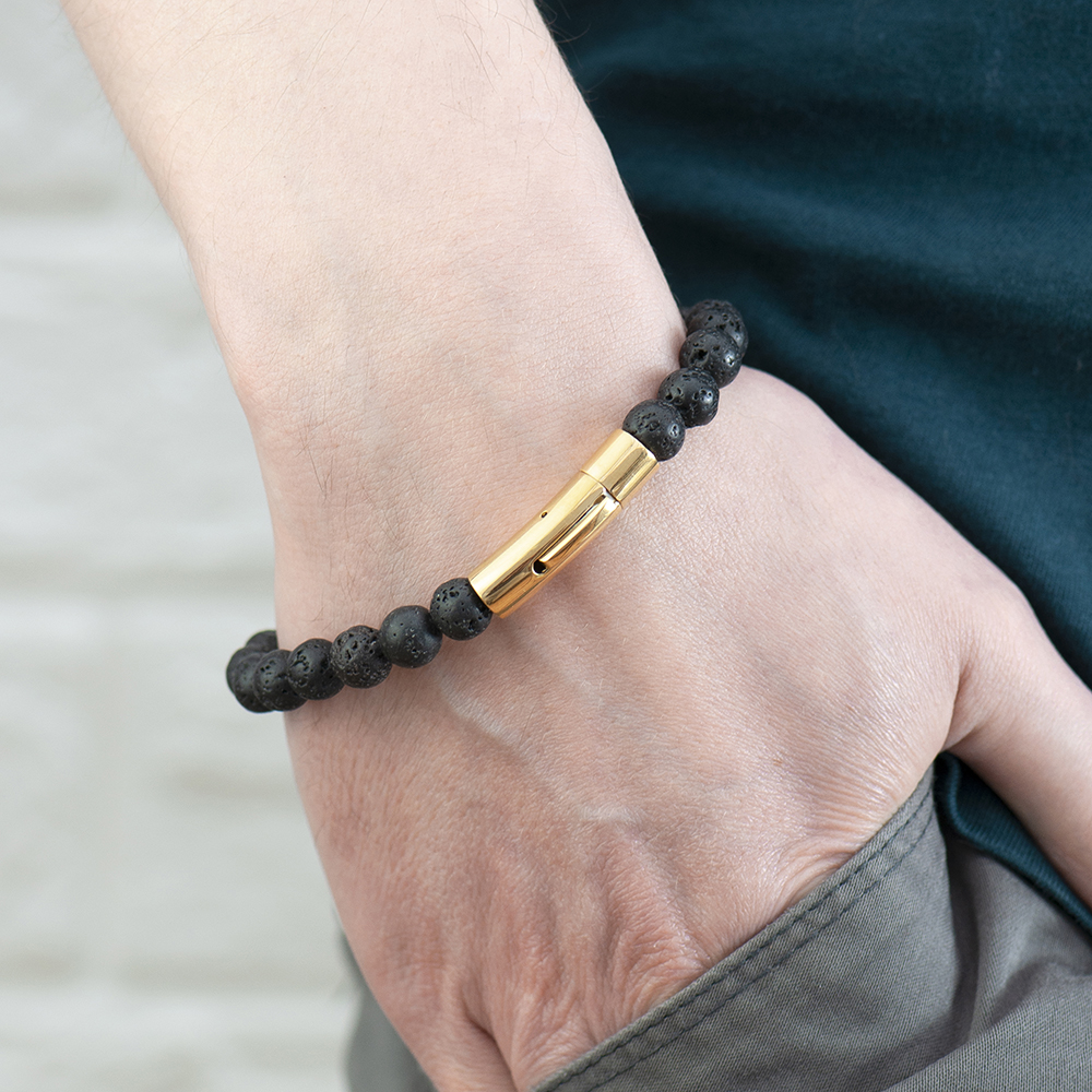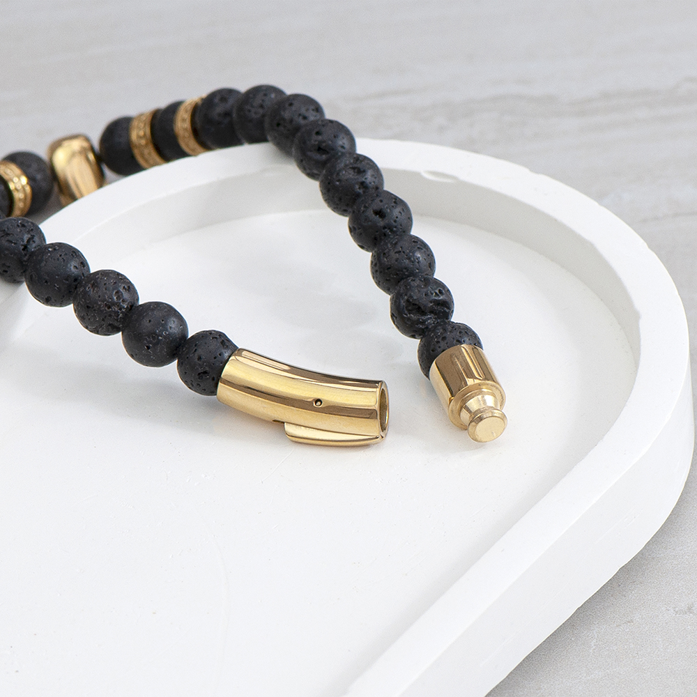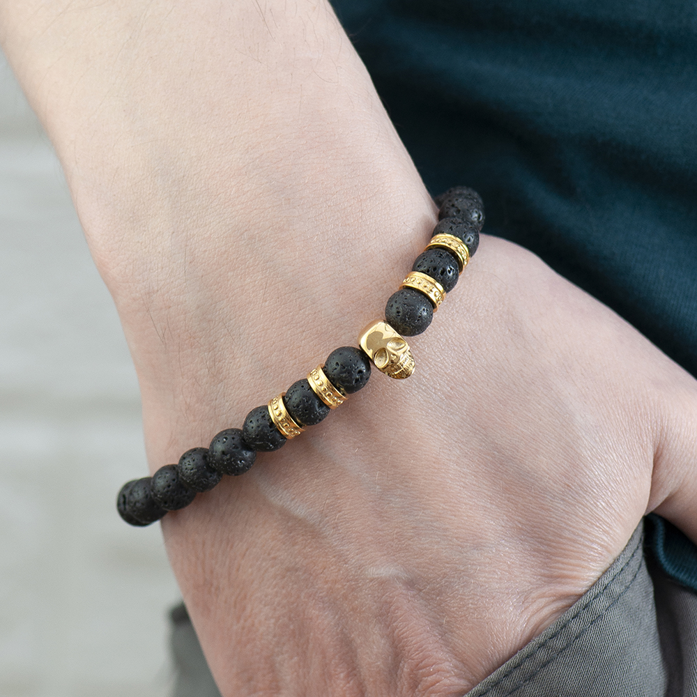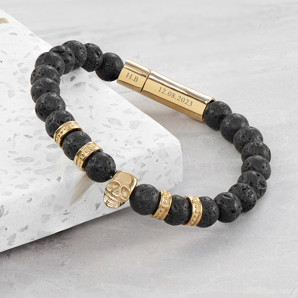 If you’re looking for that perfect Birthday or Anniversary gift for that special man in your life? Oozing style and luxury, our Personalised Men’s Golden Skull Beaded Bracelet will make the perfect gift for him. Made from beaded black lava stone intertwined with gold plated elements, he’s sure to love this stylish accessory. What’s more, the golden skull head is sure to add a layer of intrigue and mystery to any outfit, making an unforgettable statement wherever he goes.