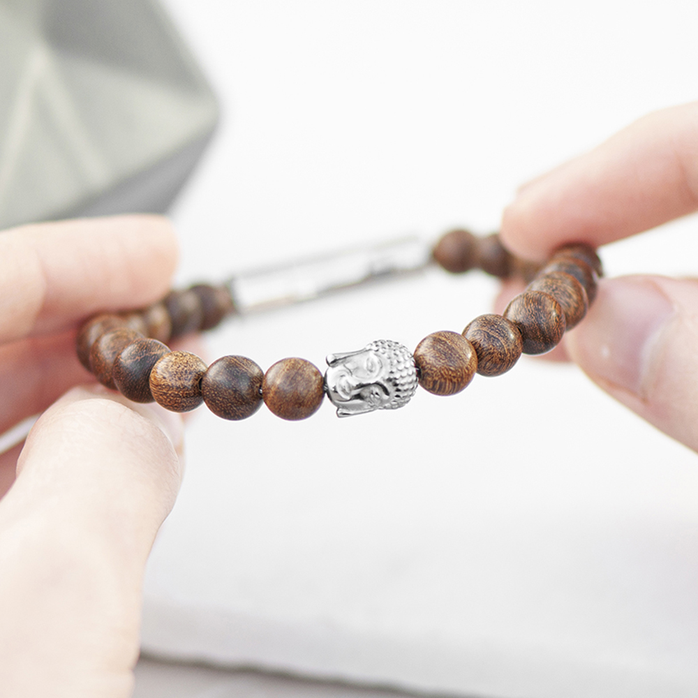 This luxury wooden beaded bracelet features a stunning, stainless steel Buddha head which spiritually symbolises wisdom and enlightenment. It will also come beautifully showcased in its own gorgeous presentation box – make it ideal for gifting.