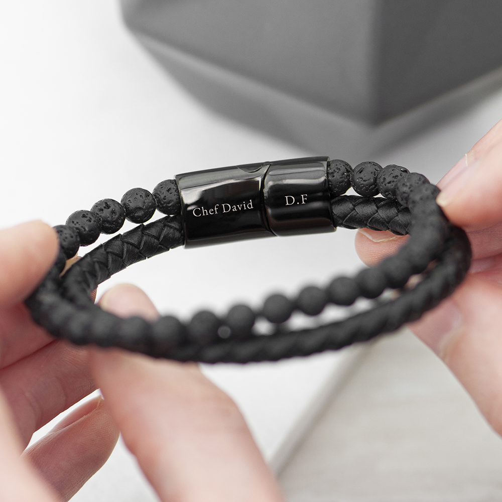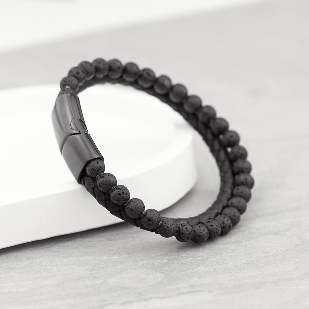 His luxury duo black bracelet features two bracelets, one made from black woven leather and the other from beaded lava stone, joined together by a magnetic clasp. Your black leather bracelet will come beautifully showcased in its own gorgeous presentation box – ideal for gifting.