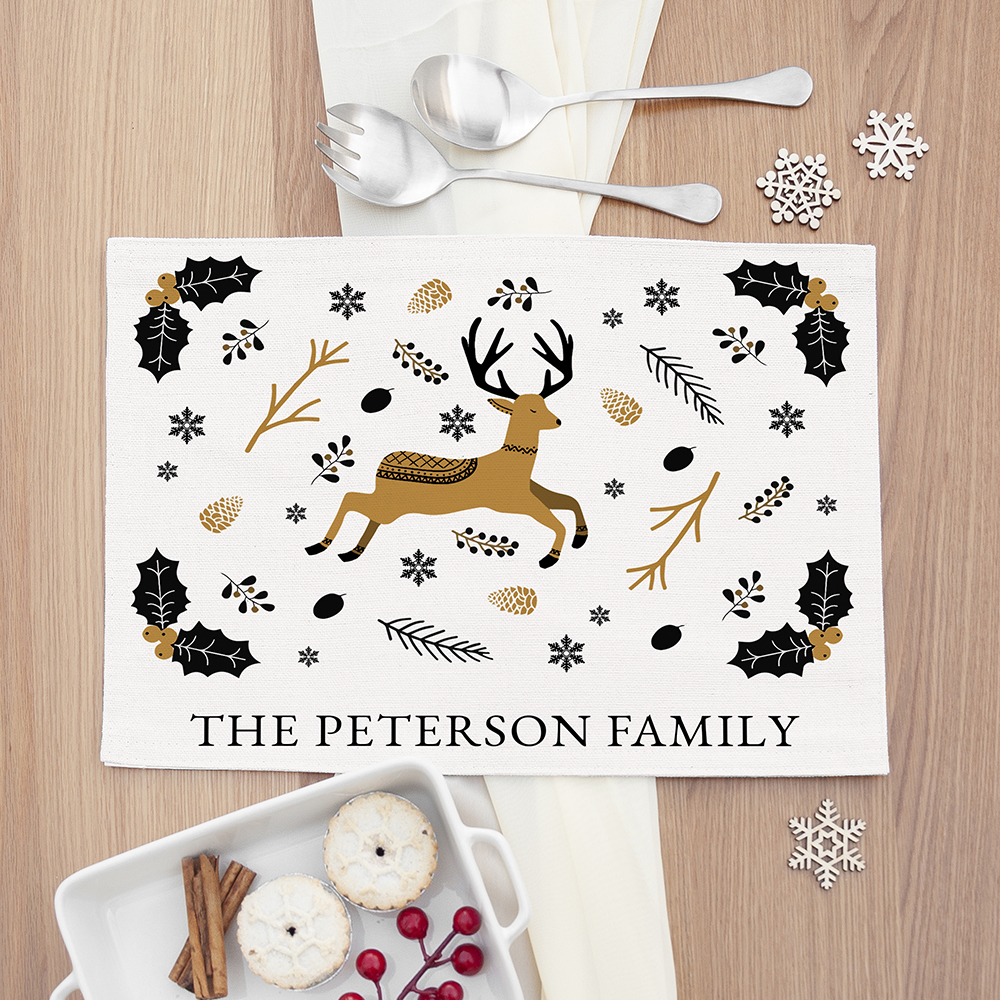 Add some Christmas magic to your dining room table this festive season with our beautiful personalised Nordic woodland placemat. A beautiful image of reindeer, with Christmassy Holly leaves and branches in the background will adorn your sleek and durable placemat, creation a wonderful Christmas homeware decoration that’ll be cherished for many Christmases to come.