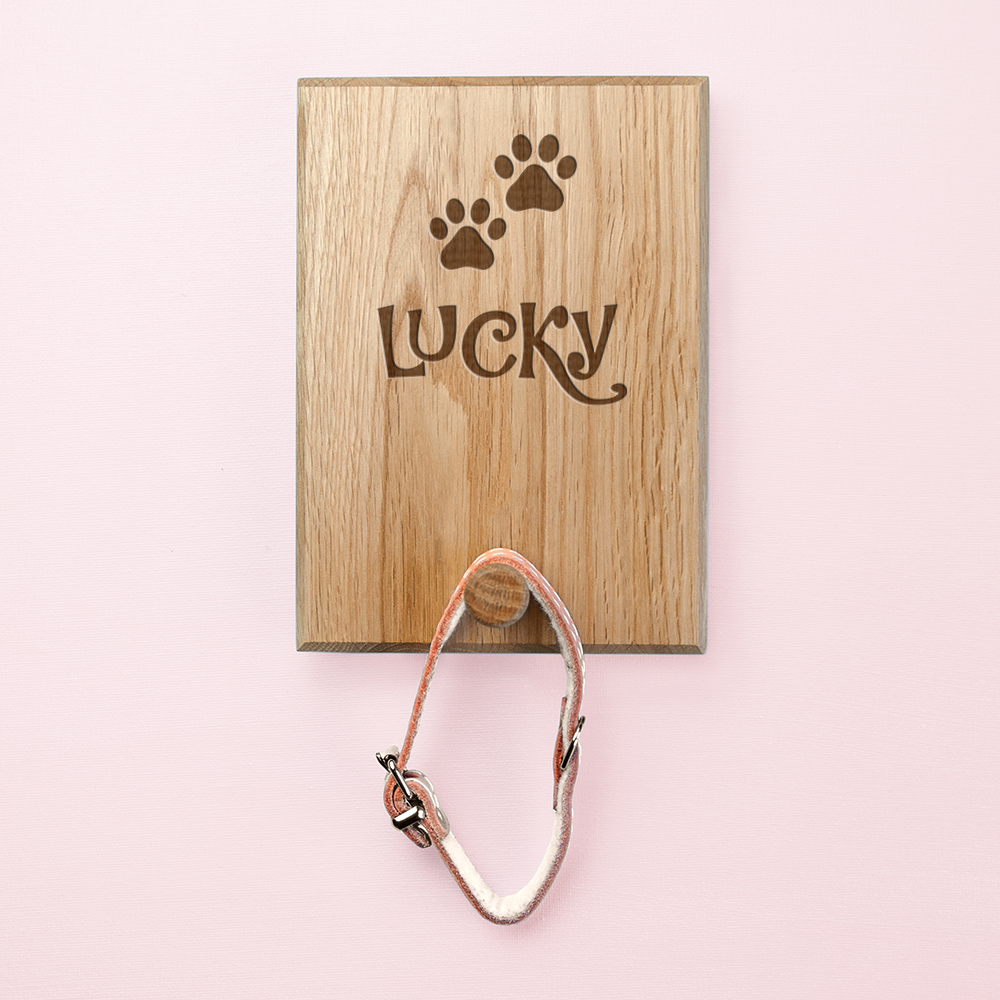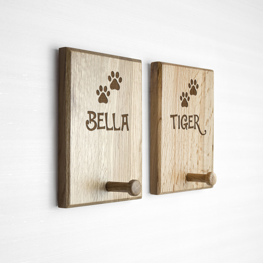 Made from solid oak and engraved with a name of your choice this hook is the perfect way to hang up their leads or collars.