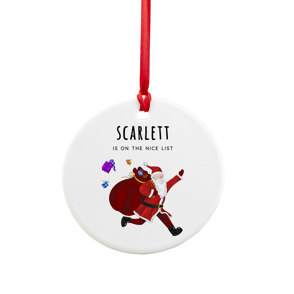 This ornament features a playful Santa Claus design carrying a sack full of presents. Above which,'[Name] is on the nice list’ comes as standard text in capitals.