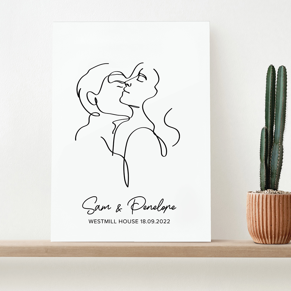 Personalise your print in a way that best represents your loving relationship, this will be placed below the line art image as standard. We recommend the coupleÕs name on the first line with the date and location of the wedding on the second line. Our specialist team will then print it onto your wall print for you, creating a premium quality gift thatÕll take pride of place on your wall for all to see.