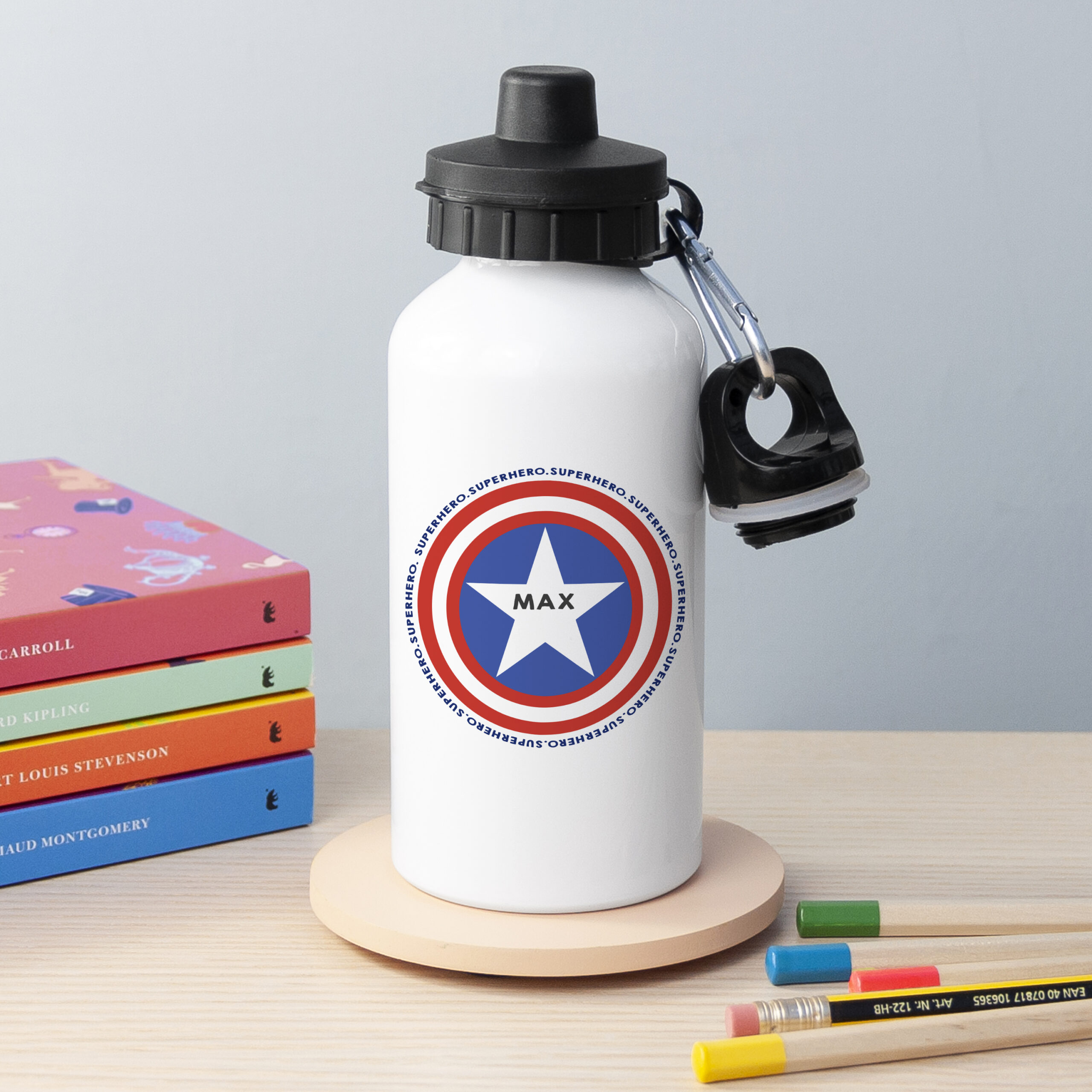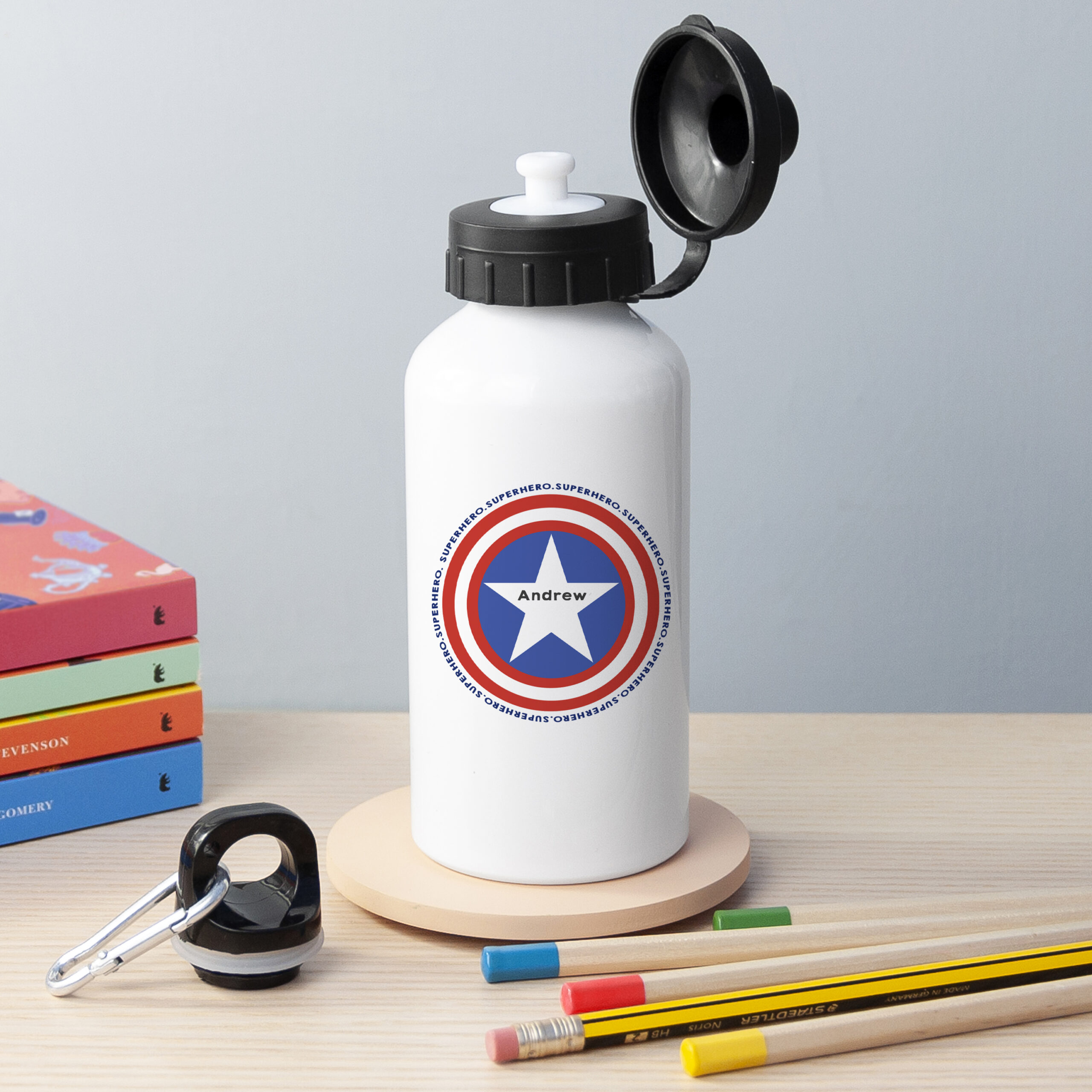 Keep your mini superhero hydrated on every mission with our sleek and fun Personalised Superhero Water Bottle. Designed to empower and quench his thirst for success, this strong white metal water bottle is great for taking school, or to stay hydrated on days out. The perfect gift for him, it’ll make a great birthday, Christmas or back-to-school present.