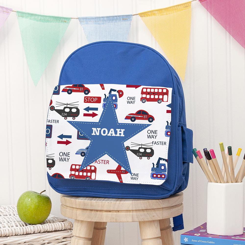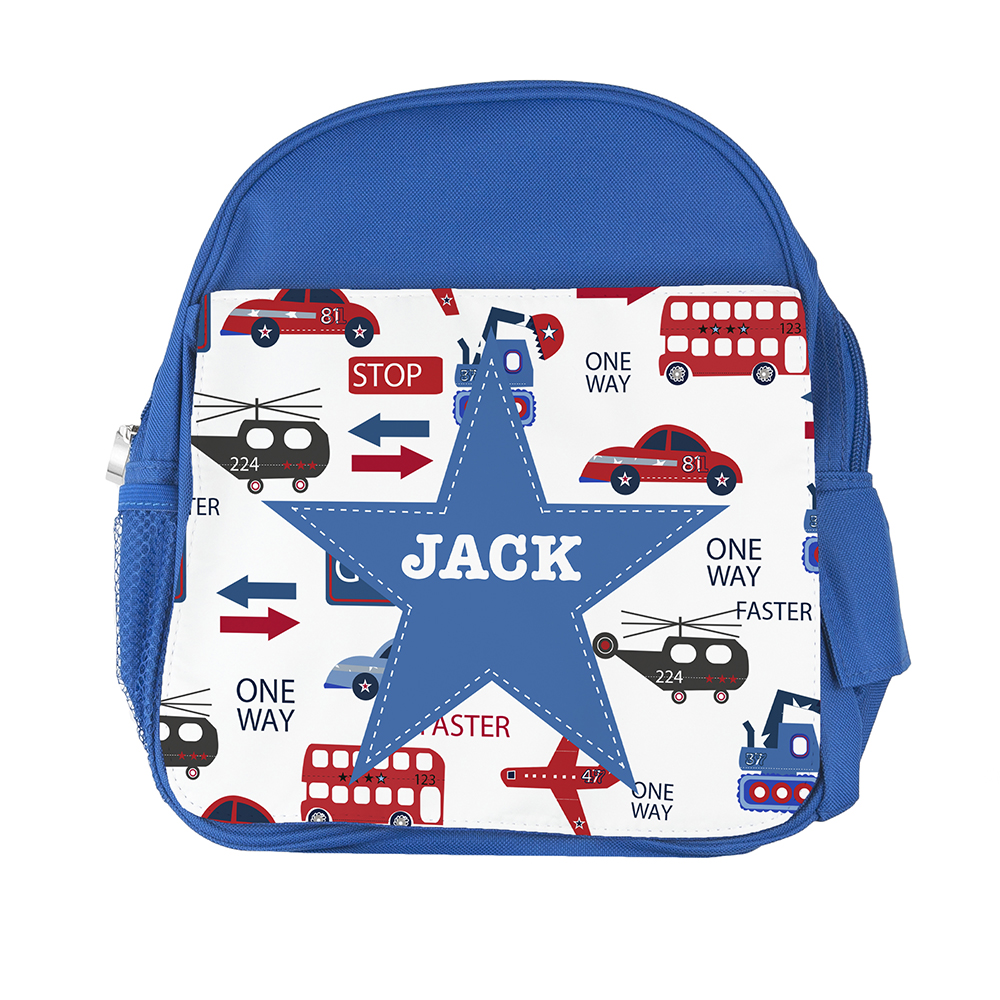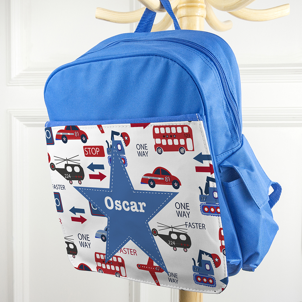 Cruise the open highways or soar the skies every lunch time with our personalised transport themed mini rucksack. The perfect birthday, Christmas or back-to-school gift for him.
