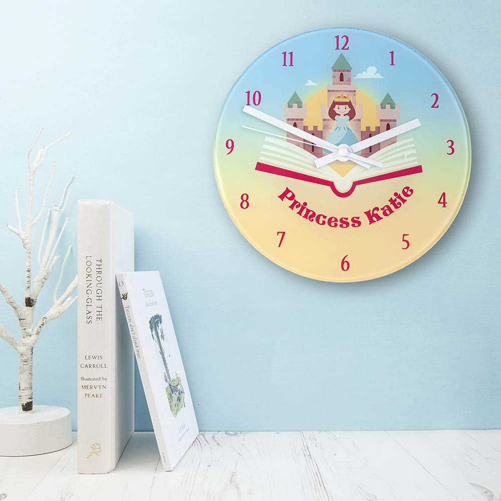 For a beautiful princess! Every little girl wants to be a princess, so a personalised princess wall clock is perfect gift. This 20cm glass wall clock is great to hang in their bedrooms. Personalise with a name up to 15 characters. Please note that the small clocks come with white hands and the large clocks come with black hands on the clock.